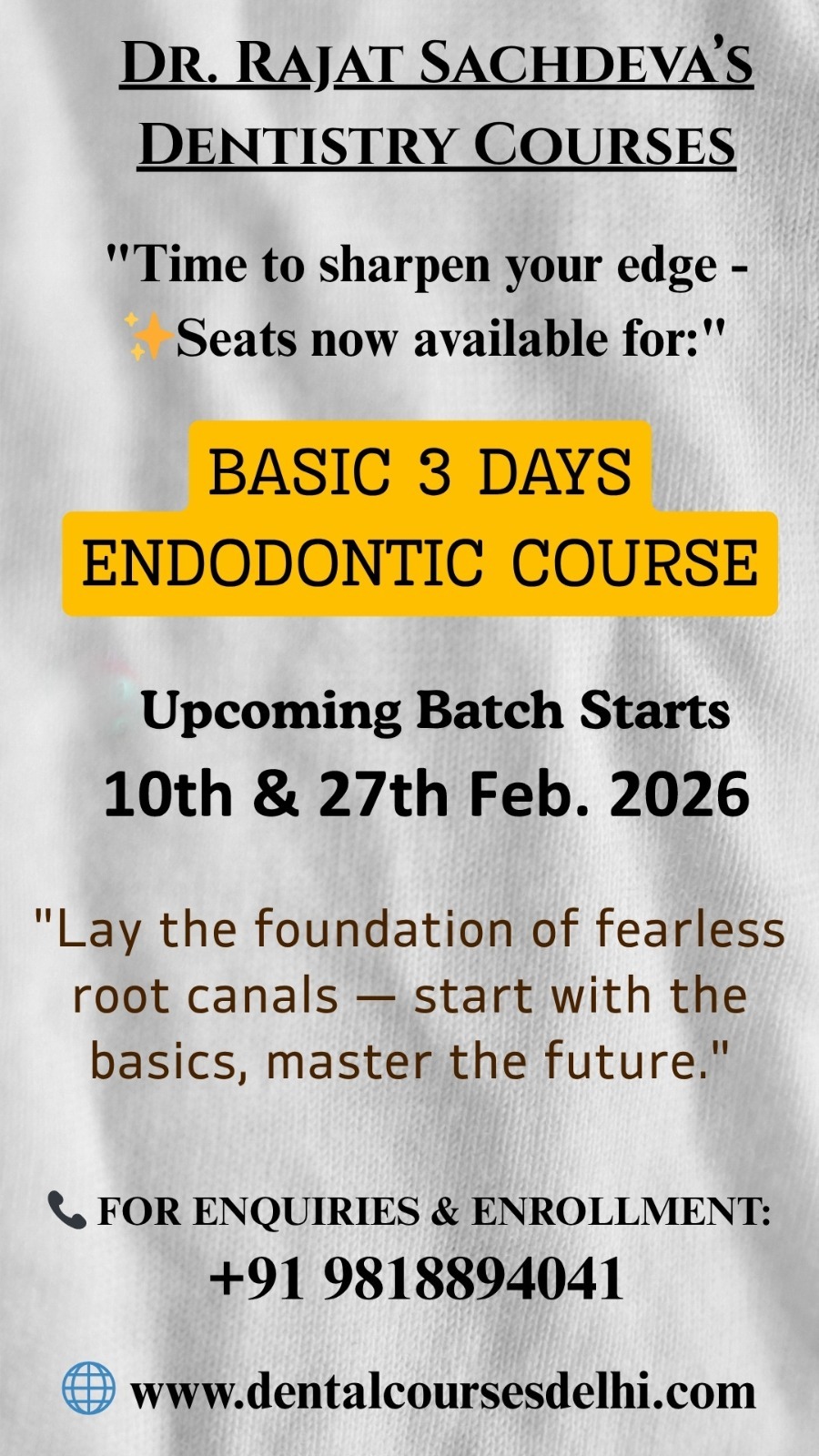 As a Maxillofacial Surgeon from Nagpur, I’ve always been confident in my surgical skills. But over time, I realized that strengthening my endodontic abilities was equally important for providing complete, well-rounded care to my patients. That’s when I decided to join Dr. Rajat Sachdeva’s 3-Day Basic Endodontics Course in Delhi—to rebuild my basics and reconnect with the core principles of Root Canal Treatment.