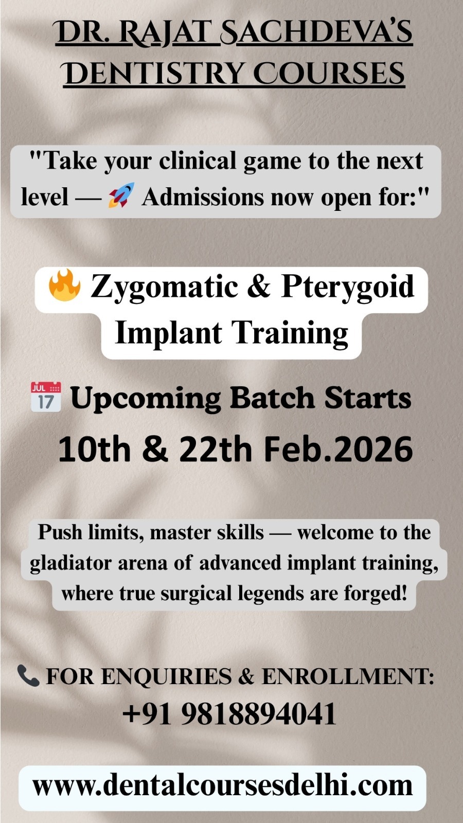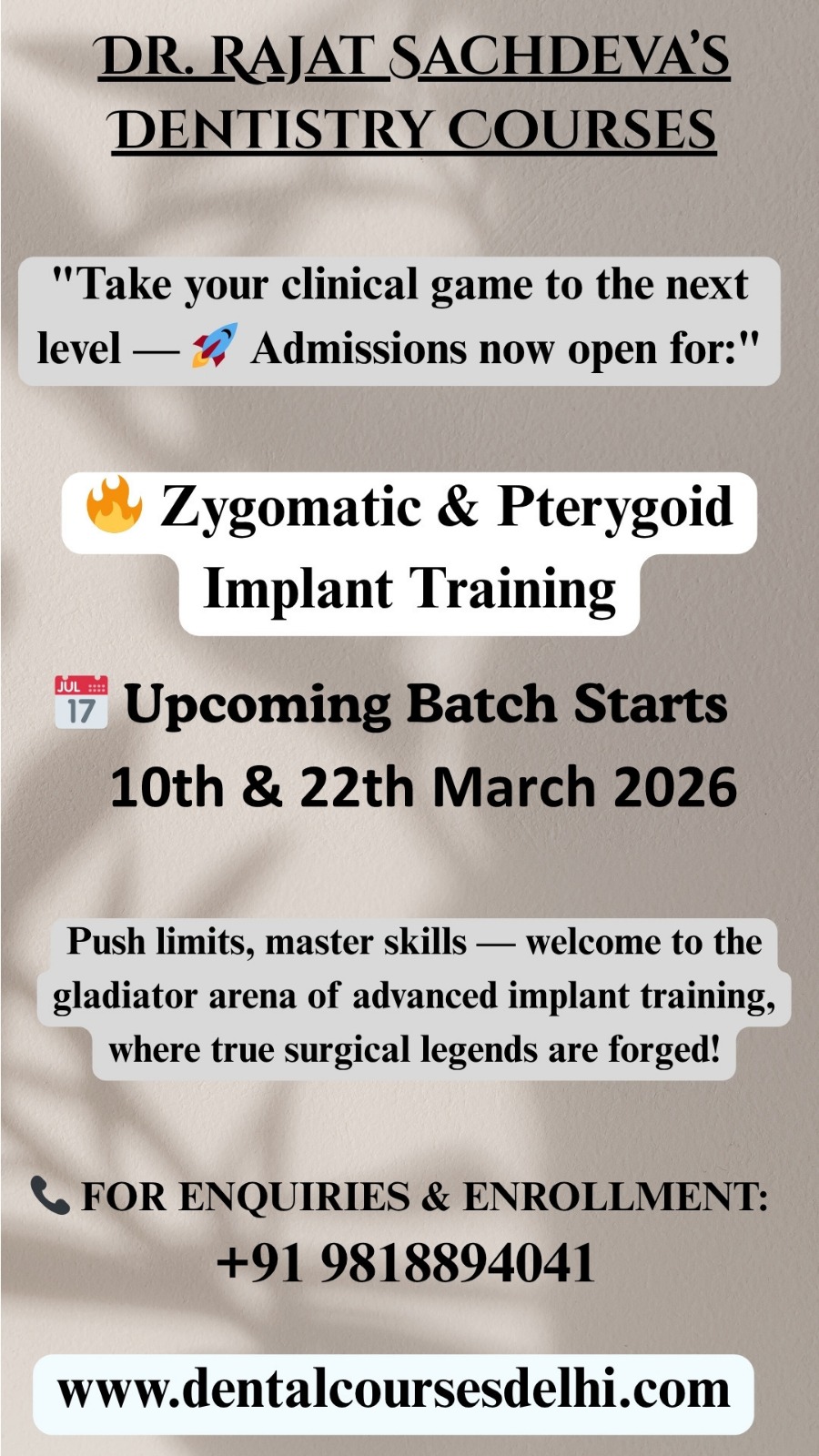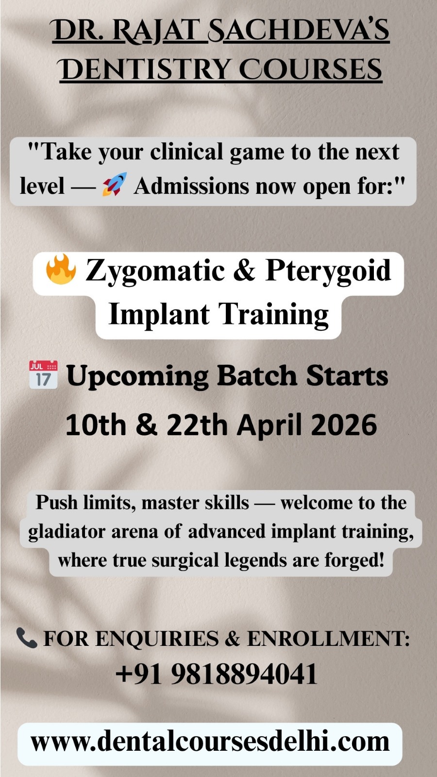 This comprehensive, step-by-step course for beginners covers presurgical and surgical treatment planning, surgical procedures, and clinical protocols for placing zygomatic implants as a nongrafting alternative for rehabilitation of the atrophic maxilla in carefully selected patients. Attendees will gain hands-on experience using cadaver specimens as well as perform Implants on live patients under the supervision of a highly experienced surgeon Dr.Rajat Sachdeva MDS & his team.