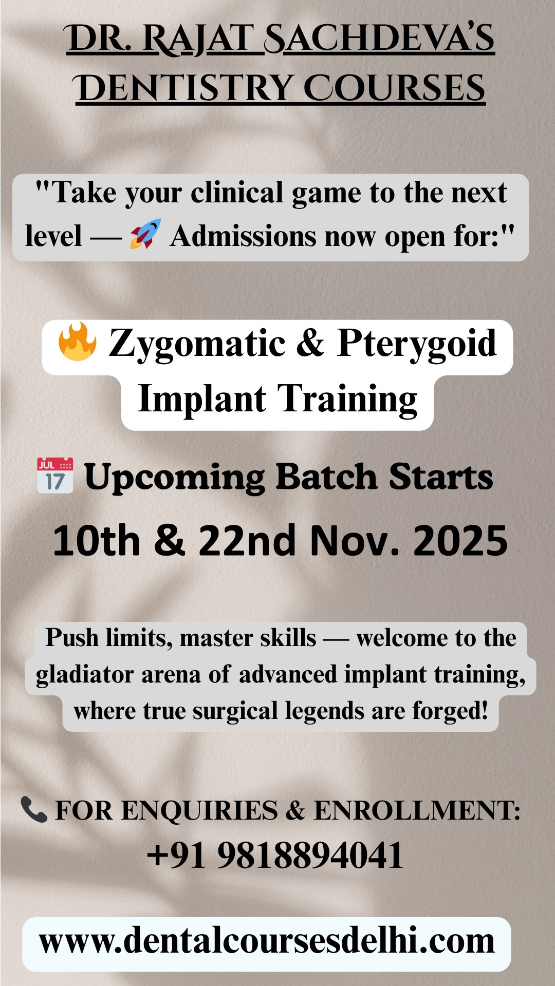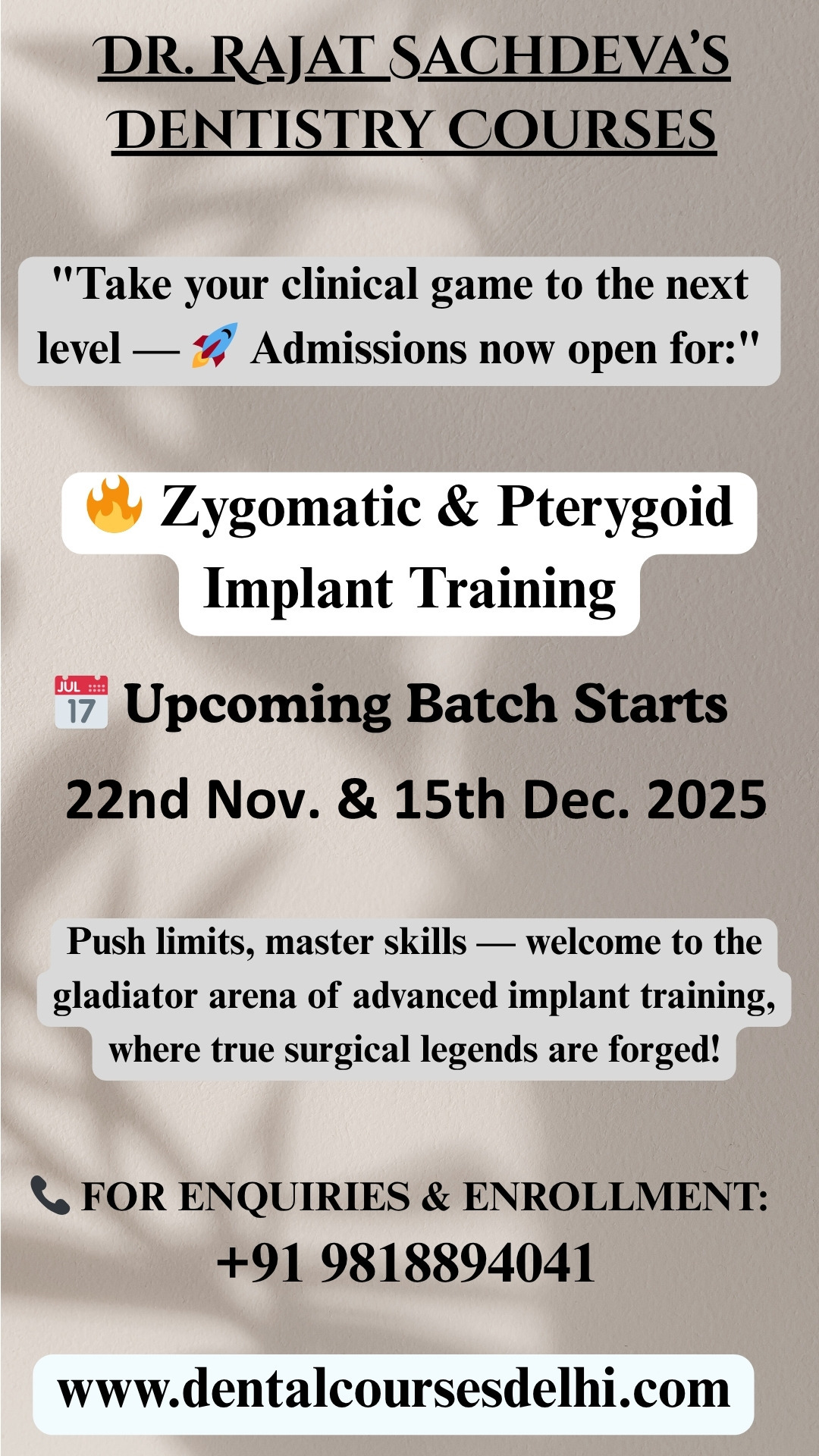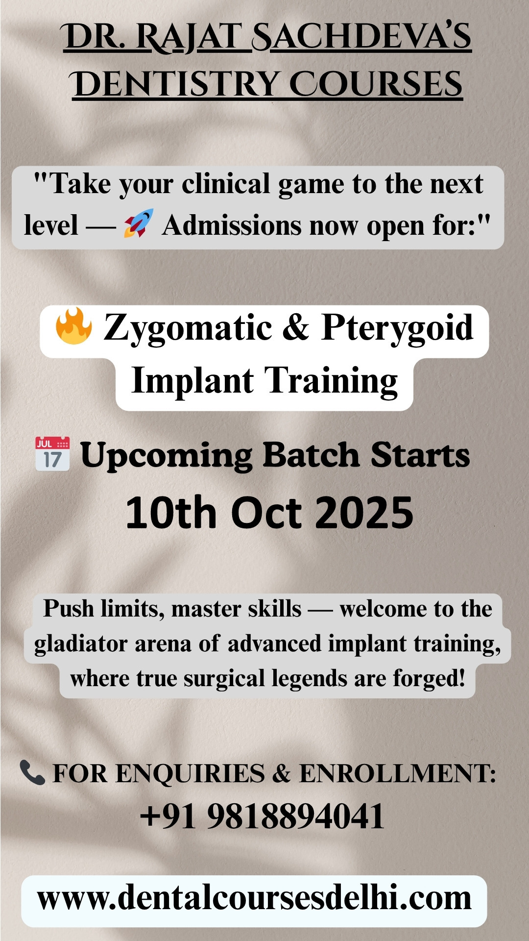This comprehensive, step-by-step course for beginners covers presurgical and surgical treatment planning, surgical procedures, and clinical protocols for placing zygomatic implants as a nongrafting alternative for rehabilitation of the atrophic maxilla in carefully selected patients. Attendees will gain hands-on experience using cadaver specimens as well as perform Implants on live patients under the supervision of a highly experienced surgeon Dr.Rajat Sachdeva MDS & his team.