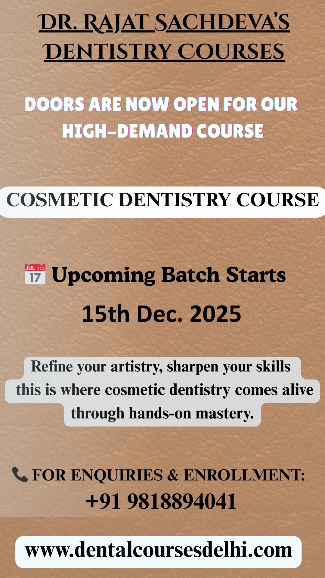 With the advent and availability of new techniques and materials in dentistry, it is just possible to save and restore the tooth with different types of restorations. There are a lot of changes going on dentistry; the cosmetic dentistry training will provide the clinician an opportunity to update their knowledge on the evidence based protocols combined with sound clinical judgment and to provide the best result to the patient.
